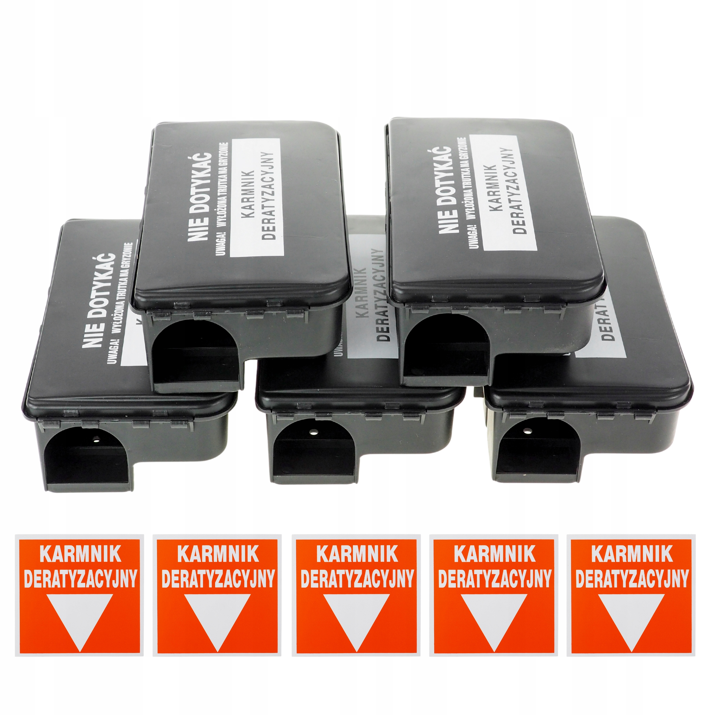 Zestaw 5 karmników deratyzacyjnych CORAL z nadrukiem ostrzegawczym i naklejkami ostrzegawczymi na ścianę GRATIS!