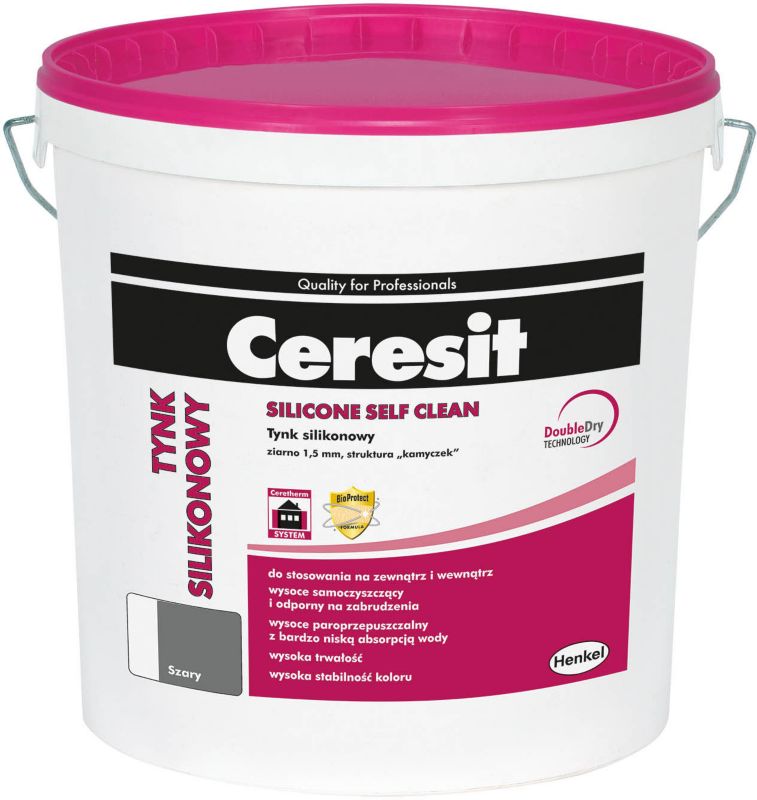 Ceresit sivá silikónová omietka 25 kg je odolný výrobok s výbornými vlastnosťami. Omietka odolná voči rozvoju plesní, húb a rias je vhodná na vnútorné aj vonkajšie použitie. Omietka sa vyznačuje vysokou paropriepustnosťou. Je tiež odolný voči nečistotám. Vďaka týmto vlastnostiam je ideálny pre vonkajšie steny. Silikónová omietka Ceresit sivá je určená na tenkovrstvové omietanie. Možno ho použiť na zatepľovacie systémy, tradičné omietky a drevotrieskové dosky a sadrokartónové dosky. Produkt bude dobre fungovať aj na betónových a omietkových podkladoch. Omietka má kamienkovú štruktúru, zrnitosť 1,5 mm. Výrobok je vyrobený z vodnej disperzie silikónových a akrylových živíc s prídavkom minerálnych plnív a pigmentov.