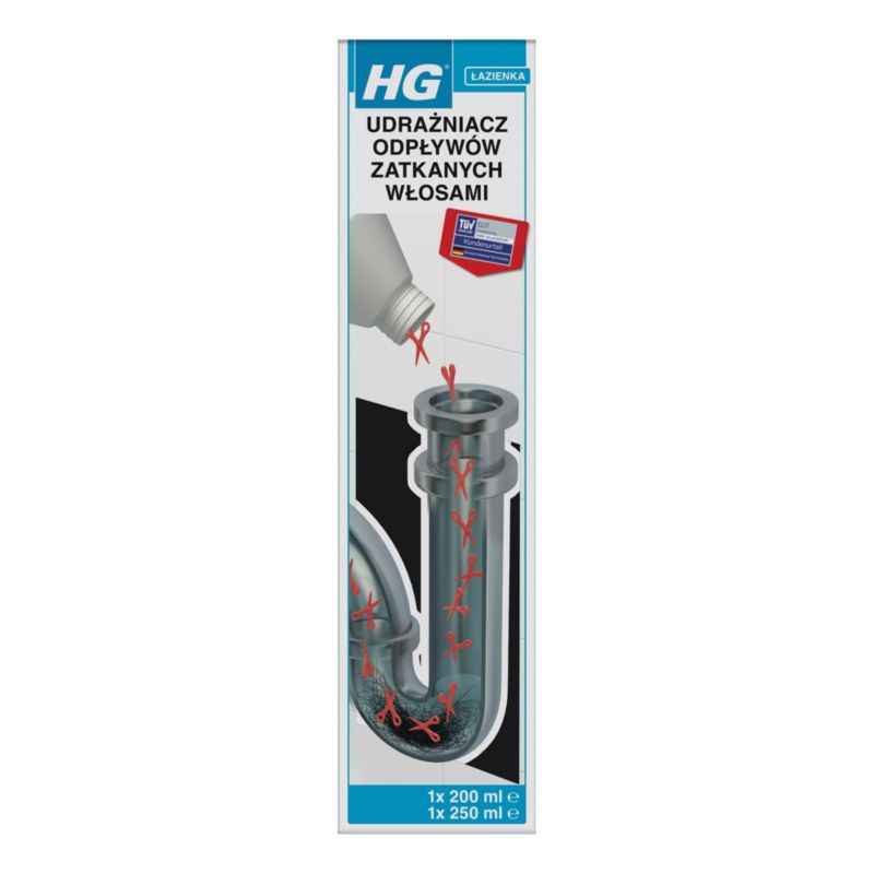 HG Hair Clogged Drain Unblocker je účinný spôsob, ako sa zbaviť organických upchávok v potrubí a odtoku vo vani, sprchovej vani alebo umývadle. Prípravok sa skladá z dvoch fľaštičiek obsahujúcich látky, ktoré po spojení mimoriadne účinne drvia vlasy, umožňujú ich opláchnutie a eliminujú upchatie drenáže.