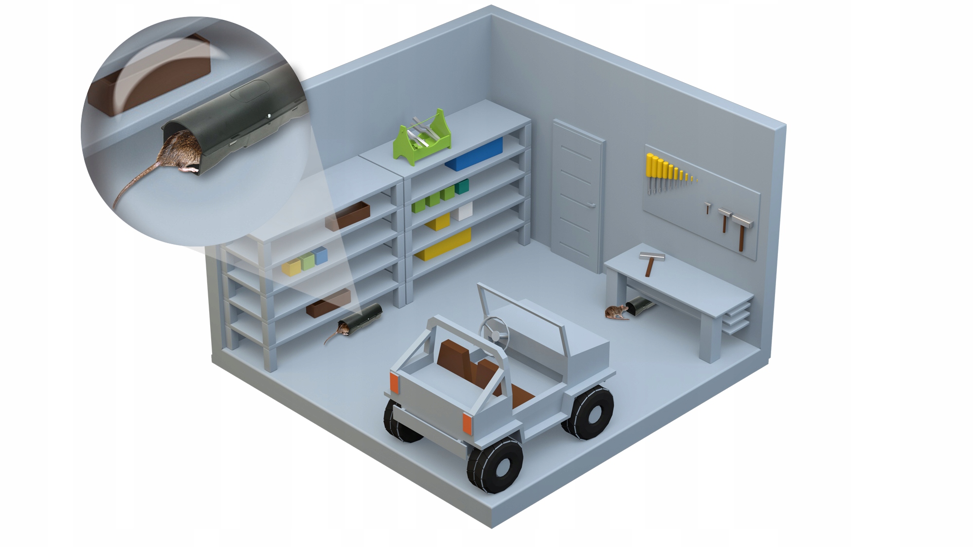 Do zariadenia by sa mal umiestniť jed na myši a potkany . Deratizačné stanice by mali byť umiestnené pozdĺž stien miestností, hlodavce ako myši sa pohybujú jedinečným spôsobom pri stenách.