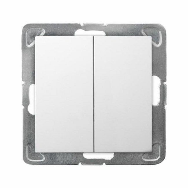 Dvojitý vypínač je prvok elektroinštalácie, ktorý umožňuje oddelenie dvoch nezávislých okruhov. V praxi to znamená, že dokáže ovládať dva svetelné zdroje. Výrobok je vhodný na ovládanie lustra s dvoma žiarovkami, možno ním zapínať a vypínať aj rôzne svetelné zdroje vo veľkej miestnosti. Dvojitý konektor zaberá na stene menej miesta ako dva samostatné a umožňuje estetické usporiadanie. Gombíky sú biele, čo sa ľahko hodí k rôznym interiérovým dekoráciám. Sú vyrobené z polykarbonátu, ktorý je možné v prípade potreby vyčistiť vlhkou handričkou. Spôsob inštalácie pod omietku zaisťuje dlhodobú životnosť. Náš sortiment zahŕňa kompatibilné rámy.