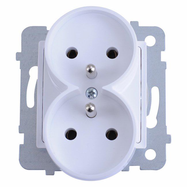 Dvojzásuvka bude slúžiť na pripojenie elektrických zariadení k zdroju energie. Výrobok má dva prípojné body, vďaka čomu je vhodný na miesta vyžadujúce viac prístupových bodov k elektrickej inštalácii. Oba prístupové body v zásuvke sú vybavené špeciálnym kovovým kolíkom, ktorý slúži ako uzemnenie, čím sa výrazne zvyšuje bezpečnosť užívateľa aj elektrického zariadenia pripojeného do siete. Výrobok je vyrobený z plastu odolného proti zničeniu, takže pri používaní bude dlho trvať. Tento typ zásuvky je určený na montáž pod omietku, čo znamená, že sa ľahko inštaluje pri rekonštrukcii miestnosti. Vďaka bielej farbe je objímka vhodná do každého interiéru.