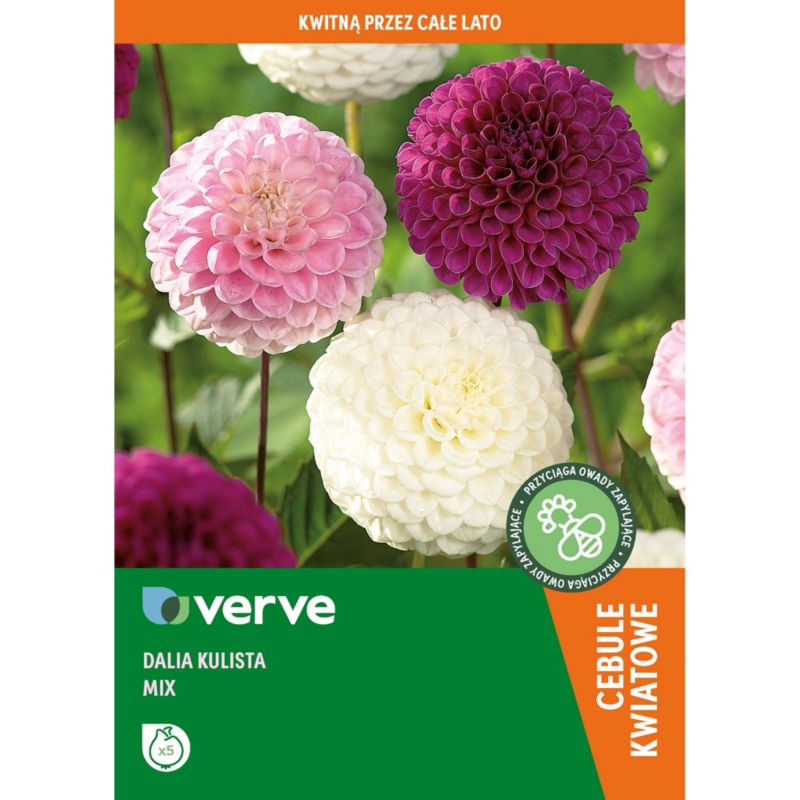 Cibuľky georgín Verve mix ball sú rozsiahlou sadou, v ktorej nájdete niekoľko odrôd týchto kvetov. Vyznačujú sa skvelou estetikou a extrémne nízkymi nárokmi. Rastlina je vhodná na rezané kvety. Môžete si ju zasadiť do záhrady alebo do kvetináčov na terase. Už v prvom roku získate viacfarebné, guľovité kvety.