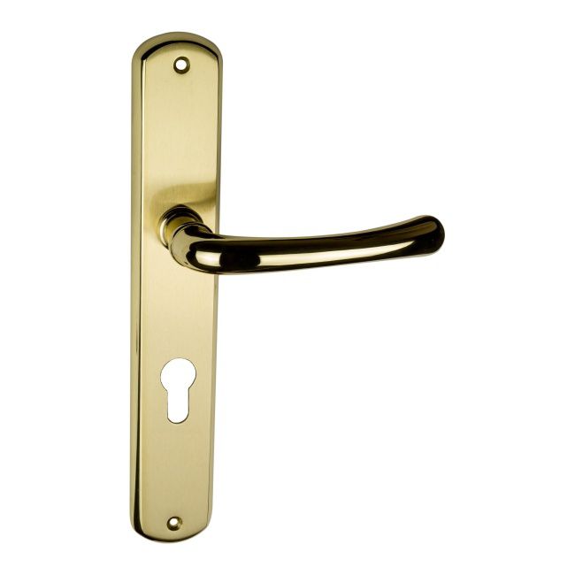 Kľučka Schaffner Gaja s mosadznou vložkou je produkt, ktorý vám umožní vytvoriť estetickú úpravu dverí v tradičnom alebo luxusnom interiéri. Rukoväť je vyrobená z mosadze a je dostupná v zlatej farbe. Dva typy povrchovej úpravy: matná a lesklá zaručujú estetický vzhľad celku. Výrobok má podlhovastý znak s otvorom na vložku.