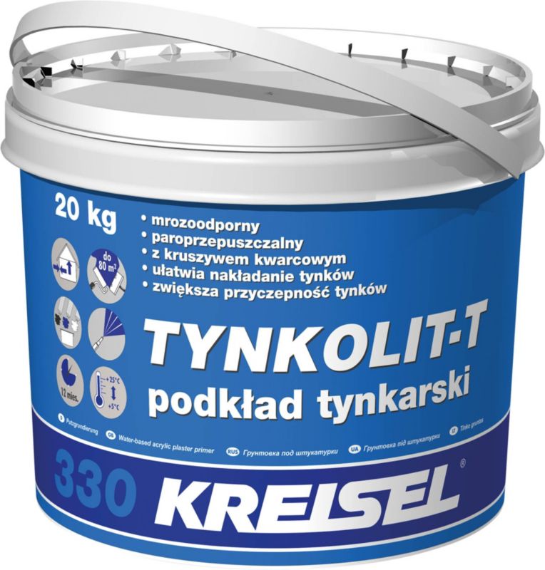 Základná omietka Kreisel Tynkolit-T 330 biela je mrazuvzdorná. Produkt je určený na aplikáciu pred omietkou. Stačí jedna vrstva, nanášaná valčekom alebo štetcom. Základný náter dodá omietke lepšiu priľnavosť a uľahčí jej nanášanie. Výrobok s kremenným kamenivom je paropriepustný.