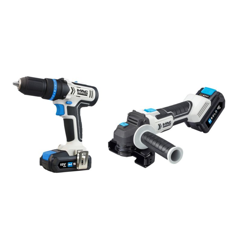 - Sada obsahuje 18V príklepovú vŕtačku Mac Allister a uhlovú brúsku. Sada obsahuje batérie Mac Allister SOLO s kapacitou 2,0 Ah a 5,0 Ah a nabíjačku. Štandardná doba nabíjania je 80 minút.