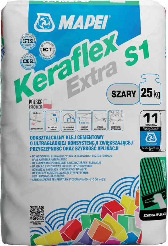 Lepidlo Mapei Keraflex Ext S1 šedé je produkt na použitie v interiéri aj exteriéri. Je to pružná látka, ktorá sa ľahko používa. Lepidlo je možné použiť s izolačnými materiálmi, ako je polystyrén alebo dosky z minerálnej vlny. Tento produkt je veľmi účinný. Vykazuje tiež vysokú odolnosť a pevnosť.