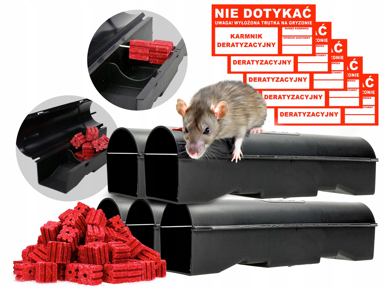 Najbardziej efektywny zestaw do usuwania myszy i szczurów - Karmnik deratyzacyjny 5 sztuk - GRATIS 500 gramów super mocnej trutki RATIMOR w formie kostki oraz 5 naklejek informacyjnych: