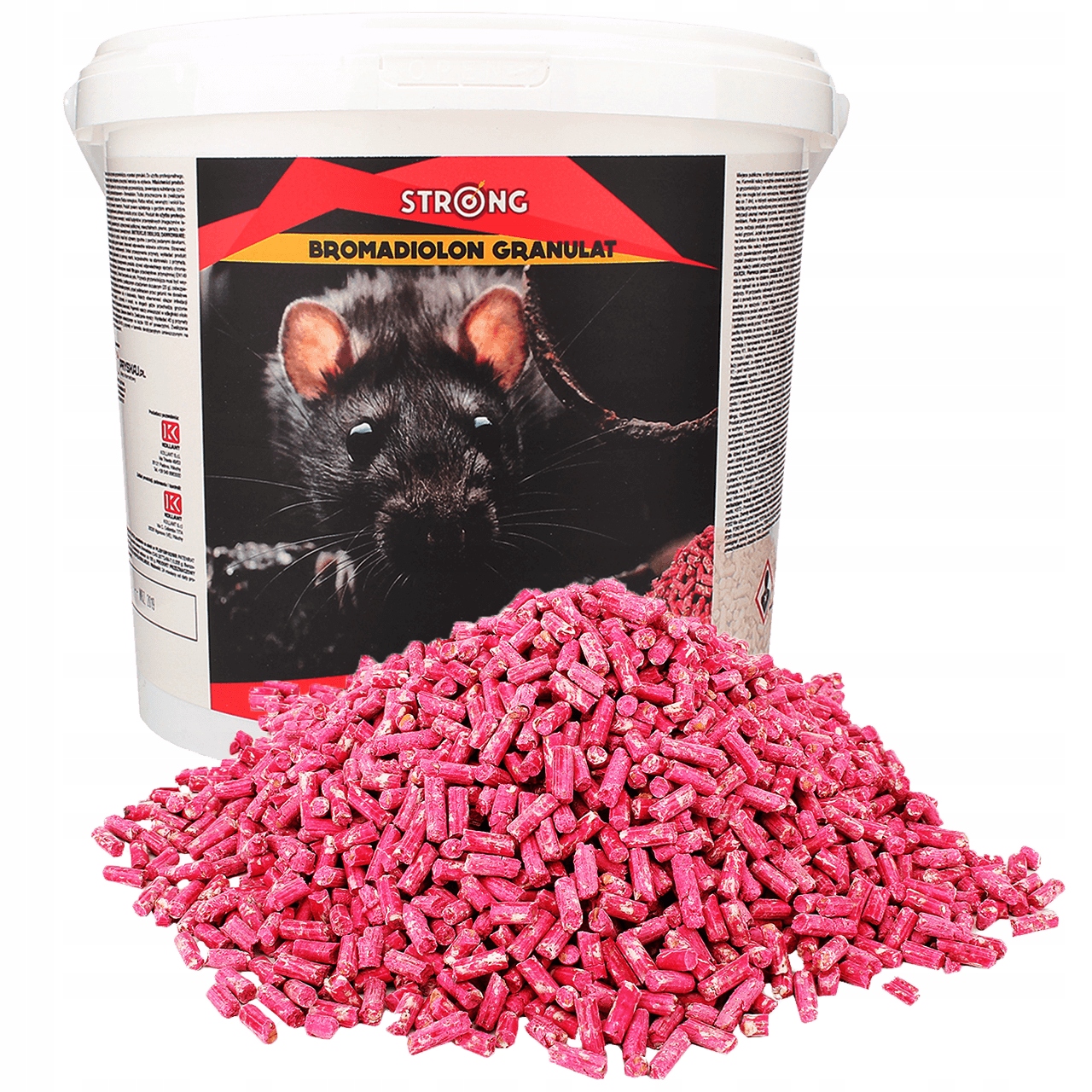 STRONG BROMADIOLON GRANULAT to bardzo skuteczny środek gryzoniobójczy w formie granulatu do zwalczania myszy i szczurów. Gryzonie po przyjęciu dawki preparatu giną bezstresowo z powodu wewnętrznego krwotoku długo po spożyciu (produkt nie prowadzi do zgonu przed upływem 48 godzin, nawet po spożyciu dużej dawki) i daleko od miejsca wyłożenia. Tym sposobem inne gryzonie nie stają się podejrzliwe i nadal spożywają przynętę aż do całkowitej eksterminacji. Preparat zawiera bromadiolon - w 100% śmiertelny już po jednorazowym spożyciu. Dodatkowo, aby zapobiec przypadkowemu połknięciu trutki, w jej składzie znajduje się gorzka substancja - bitrex - niewykrywalna dla gryzoni. Granulat STRONG zawiera starannie dobraną, innowacyjną mieszankę ziaren zbóż i kostki parafinowej tłoczoną na zimno. Powstały w ten sposób pellet zachowuje naturalne aromaty zbóż, które niezwykle skutecznie wabią gryzonie.