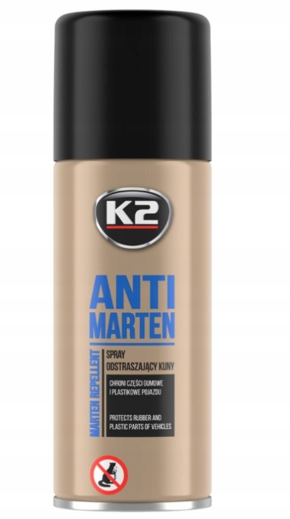 Spray na kuny K2 ANTI MARTEN to wysoce skuteczny środek chroniący elementy samochodu przed uszkodzeniem ze strony kun i gryzoni. Zapobiega przegryzaniu kabli, przewodów czy niszczeniu elementów wygłuszenia, czego efektem mogą być kosztowne awarie pojazdu.