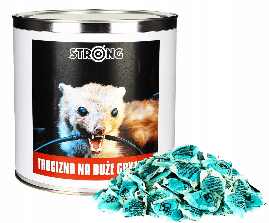 STRONG TRUCIZNA NA DUŻE GRYZONIE to silny preparat gryzoniobójczy skuteczny przeciw trudnym do zwalczania gryzoniom. Preparat dzięki smakowitym składnikom mieszkanki jest wykrywany przez szkodniki nawet ze znacznej odległości, a dzięki zawartości sprawdzonej substancji czynnej - DIFENAKUM - jest w 100% śmiertelny już po jednorazowym spożyciu.