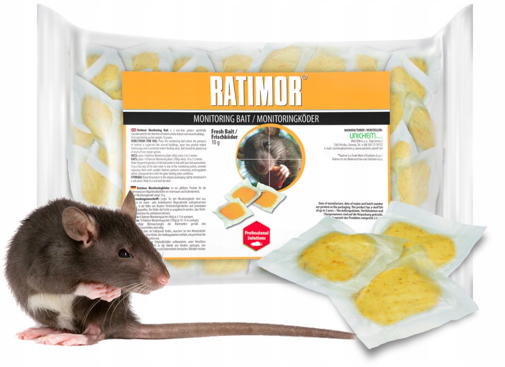Przynęta RATIMOR ze względu na swoje właściwości to produkt ceniony wśród specjalistów zajmujących się deratyzacją. Idealnie sprawdza się jako zanęta w wszelakich pułapkach, żywołapkach, chwytaczach na gryzonie. Spróbuj sam i przekonaj się o wyjątkowej skuteczności RATIMOR'a!