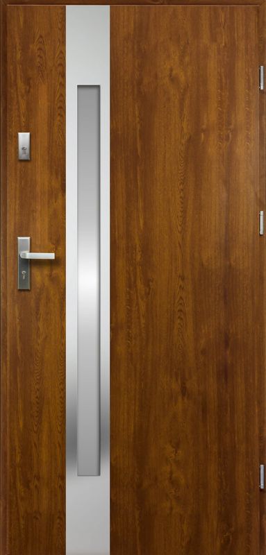OK Doors Arctica pravé vonkajšie dvere, zlatý dub, skvele poslúžia v modernej budove. Vďaka nim sa do vášho domova nedostane žiadny votrelec. Výrobok je vyrobený z ocele. Dekoračná fólia, ktorá ho pokrýva, je odolná voči UV žiareniu. Krídlo dverí je vybavené tromi nastaviteľnými pántmi. Prezentovaná zostava pozostáva z dverí, zárubní a kovania.