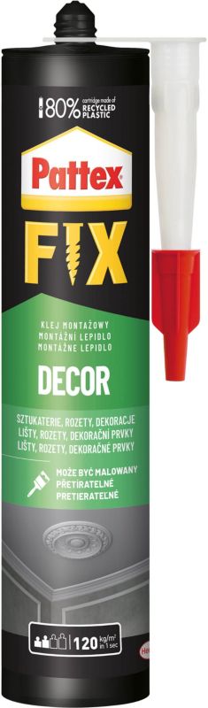 Montážne lepidlo Pattex Fix Decor 380 g je ekologický prípravok na báze akrylátovej disperzie, určený na vnútorné použitie. Lepidlo má široké využitie. Dá sa použiť na lepenie materiálov ako drevo, omietka a keramika. Je vhodný aj na polystyrén, korok, drevotriesku a sadrokartón. Môžete ním vyplniť medzery v podklade a nahradiť skrutky, klince alebo hmoždinky. Lepidlo bude užitočné pri inštalácii stien a soklových dosiek. Môžete ním lepiť panely, rímsy, ozdobné dosky, ozdobné profily a drevené lišty. Lepidlo sa ľahko používa. Aplikuje sa pomocou stláčača kaziet. Aby lepidlo fungovalo, musí byť aspoň jeden z povrchov savý. Montážne lepidlo Pattex Fix Decor je vodeodolné a flexibilné. Ľahko sa čistí a dá sa natrieť.