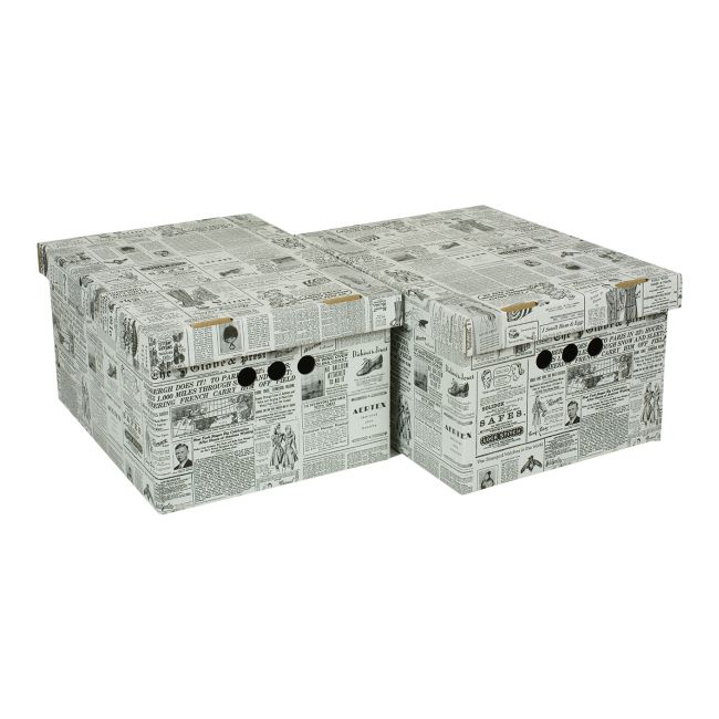 Krabička je vyrobená z trojvrstvovej vlnitej lepenky s odolnou flexotlačou imitujúcou noviny, vďaka čomu predmet vyzerá zaujímavo a obohatí dekor každej miestnosti. Súčasťou balenia sú dve škatuľky rovnakej veľkosti s dvoma vrchnákmi, ktoré ochránia predmety vo vnútri pred prachom a nečistotami. Do boxov môžete uložiť oblečenie, hračky, knihy a iné rôzne predmety. Dekoračné boxy vám tiež pomôžu triediť rôzne drobnosti, ale aj noviny a dôležité dokumenty, ktoré chcete mať vždy po ruke. Vonkajšia strana krabice vyzerá ako noviny, ale vnútorné steny kartónu sú čierne, čo zvyšuje ich vizuálnu atraktivitu.