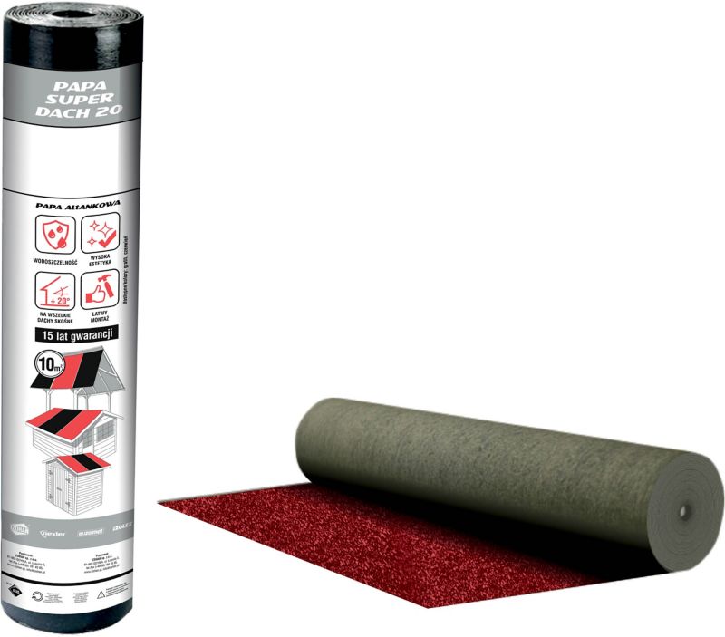 Strešná lepenka Superdach 20 10 m2 vám zabezpečí účinnú hydroizoláciu strechy. Na spoľahlivú ochranu strechy vašej budovy stačí naniesť len jednu vrstvu. Strešná lepenka je veľmi ľahká, takže ju jednoducho nainštalujete na šikmú drevenú strechu alebo z OSB dosiek. Na tento účel potrebujete len klince s podložkami a bitúmenovými lepidlami - nemusíte kupovať zváracie zariadenie. Strešná lepenka Superdach je vyrobená z bitúmenu, matrice z polyesterovej netkanej textílie vystuženej skleneným vláknom a prírodného vrchného náteru zafarbeného na červeno. Pri nízkych teplotách nestráca pružnosť, zachováva si aj svoje vlastnosti a netečie pri teplotách do 100 stupňov Celzia. Pozrite si našu ponuku strešných krytín.