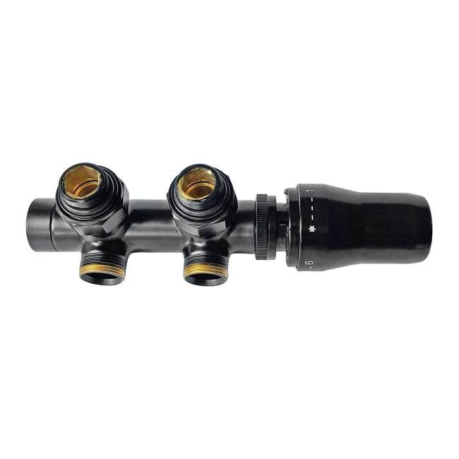 Termostatická súprava Luxrad Duo ľavá čierna matná je pevný výrobok vyrobený v Poľsku. Na jeho výrobu boli použité plasty, mosadz a poniklovaná mosadz. Použitie termostatickej hlavice a ľavého termostatického ventilu integrovaného so spätným ventilom vám umožní vytvoriť funkčnú inštaláciu vody ústredného kúrenia. Matná čierna farba pôsobí mimoriadne elegantne a štýlovo.