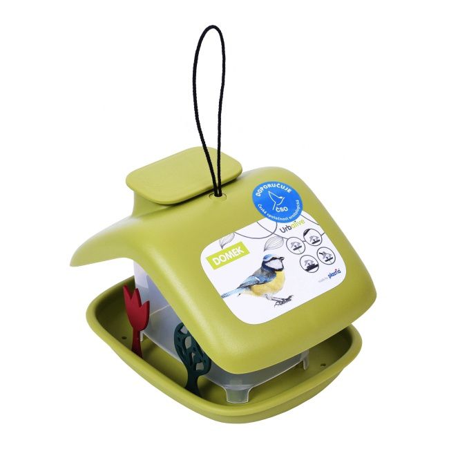 Zelené plastové domčekové kŕmidlo je produkt určený na skladovanie potravy pre vtáky. Jeho pevná konštrukcia je odolná voči atmosférickým javom a drobnému mechanickému poškodeniu. Podávač môžete tiež jednoducho udržiavať v čistote. Na konci sezóny skladujte kŕmidlo na suchom a tienenom mieste.